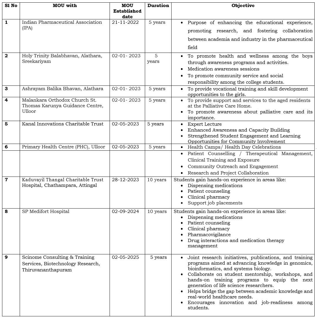 Mar Dioscorus College of Pharmacy establishes Memoranda of Understanding (MoUs) with industries and organizations to strengthen academic collaboration, research, and professional training. These partnerships provide students with industrial exposure, internships, skill development opportunities, and improved placement prospects. MoUs also support joint research activities, faculty development, resource sharing, and community outreach programs. Overall, they help bridge the gap between academic learning and industry practice while enhancing institutional quality and accreditation standards.