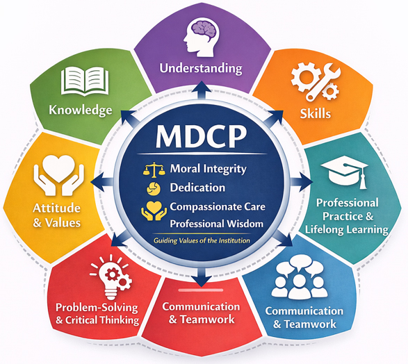 The curriculum is structured around the KUSA framework—Knowledge, Understanding, Skills, and Attitude—to ensure holistic development of students in alignment with the guiding value of Moral Integrity, Dedication, Compassionate Care, and Professional Wisdom.